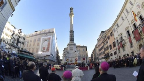 Chiều hôm qua, lúc 3 giờ rưỡi, ĐTC đã đến Đền Thờ Đức Bà Cả, dâng hoa kính Đức Mẹ là Phần Rỗi của dân Roma, trước khi đến Tượng đài Đức Mẹ Vô Nhiễm ở Quảng trường Tây Ban Nha, trước trụ sở Bộ truyền giáo được Đức Chân phước Giáo Hoàng Piô 9 khánh thành ngày 8-9 năm 1857, tức là 3 năm sau khi tuyên bố tín điều Đức Mẹ Vô Nhiễm Nguyên Tội. Cột cao 11,81 mét trên đó có tượng Đức Mẹ đầu đội triều thiên 12 ngôi sao.