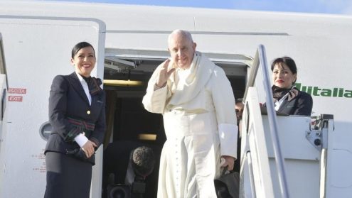 Khi ra tới phi trường quốc tế Fiumicino của thành Roma lúc hơn 9 giờ sáng, ĐTC đã được các giới chức đạo đời chào đón. Sau đó, tay trái xách chiếc cặp đen, ĐTC bước lên thang để đến cửa chiếc máy bay Airbus A330 của hãng Alitali. Tại đây, như mọi lần, trước khi vào trong máy bay, ĐTC đã chào hai chiêu đãi viên và chỉ huy của chuyến bay.