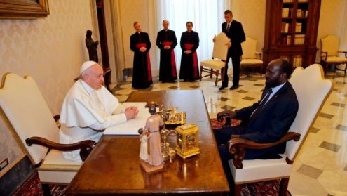 “Trong các cuộc hội kiến thân mật, có nhắc đến quan hệ song phương tốt đẹp giữa Nam Sudan và Tòa Thánh, cũng như sự đóng góp của Giáo Hội Công Giáo tại nước này trong lãnh vực giáo dục và y tế, cũng như trong tiến trình hòa giải và tái thiết đất nước. Hai bên cũng đề cập đến những vấn đề liên quan đến việc thực thi hiệp định mới ký kết giữa các tác nhân chính trị khác nhau, để đạt tới một giải pháp chung kết cho các cuộc xung đột, hồi hương những người tị nạn và di dân, cũng như phát triển toàn diện cho đất nước. Trong bối cảnh đó, ĐTC bày tỏ mong ước có những điều kiện cho cuộc viếng thăm của Ngài tại Nam Sudan, như dấu chỉ sự gần gũi nhân dân và khích lệ tiến trình hòa bình tại nước này”.