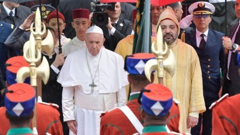 Lên tiếng sau lời chào mừng của Quốc Vương Mohammed VI, ĐTC bày tỏ vui mừng và biết ơn vì cuộc viếng thăm này cho ngài được khám phá sự phong phú của đất nước Maroc và các truyền thống tại đây. Ngài cũng nhắc đến cuộc gặp gỡ cách đây 800 năm giữa thánh Phanxicô Assisi và Vua Hồi giáo al-Malik al-Kamil bên Ai Cập, chứng tỏ sự can đảm gặp gỡ và giơ tay ra cho nhau là một con đường hòa bình và hòa hợp cho nhân loại, tại nơi mà trào lưu cực đoan và oán ghét là những nhân tố chia rẽ và tàn phá. ĐTC khẳng định rằng: