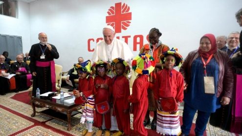 Hoạt động cuối cùng của ĐTC chiều ngày đầu tiên tại Maroc, 30-3-2019, là cuộc gặp gỡ với những người di dân tại trụ sở của Caritas tổng giáo phận Rabat, cách Học viện Hồi giáo khoảng 9 cây số.