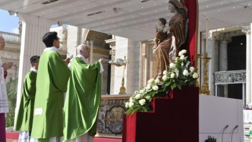 Hôm nay, chúng ta cũng cần một người mẹ và chúng ta phó thác cho tình mẫu tử của Đức Maria, Đức Mẹ chỉ đường, Mẹ của bao con đường đau thương, chúng ta phó thác cho Mẹ, những người di cư và tị nạn, cùng với những người sống ở vùng biên của thế giới và những người đã chọn để đồng hành với họ.