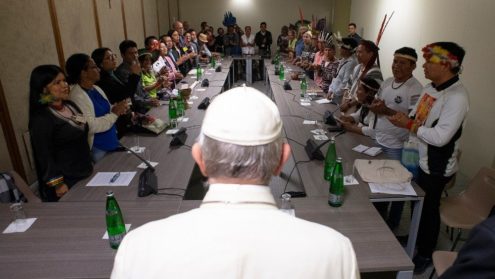 Theo Phòng Báo chí Tòa Thánh, cuộc gặp gỡ đã được bắt đầu với bài phát biểu ngắn của hai đại diện người bản xứ, một nam và một nữ. Cả hai đều nói lên lòng biết ơn đối với ĐTC vì đã triệu tập Thượng hội đồng và xin ĐTC giúp đỡ để họ có thể thực hiện ước mơ về một cuộc sống bình yên và hạnh phúc cho chính người bản địa. Hai vị đại diện cũng xin ĐTC trợ giúp để vùng đất của họ được chăm sóc, con cái được thừa hưởng tài nguyên.