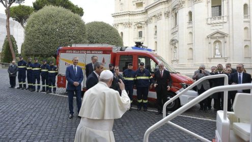 Sáng thứ tư 06/11, trước khi ra quảng trường Thánh Phêrô để gặp các tín hữu và khách hành hương, ĐTC Phanxicô đã làm phép một chiếc xe mới được tặng cho Đội cứu hỏa Vatican. Đây là một sự khích lệ lớn cho toàn thể nhân viên Đội cứu hỏa.