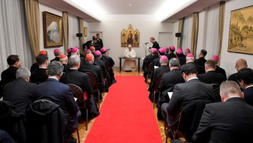 Khi tới nơi, vào lúc 18giờ 30, ĐTC được một nhóm 200 tín hữu đón tiếp. Tại đây, sau lời chào ngắn của Đức cha, Chủ tịch HĐGM, ĐTC có bài diễn văn dành cho các Giám mục.