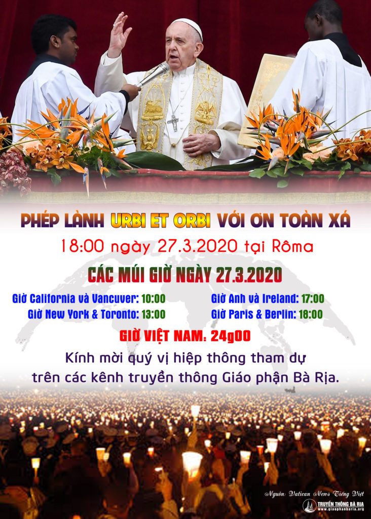 Vào ngày 25.3 vừa qua, Đức Thánh Cha Phanxicô mời gọi: “Ngay từ bây giờ, tôi mời gọi tất cả hãy tham dự cách thiêng liêng qua các phương tiện truyền thông. Chúng ta sẽ lắng nghe Lời Chúa. Chúng ta sẽ dâng lời khấn nguyện, chúng ta sẽ thờ lạy Thánh Thể, và vào cuối buổi cầu nguyện, tôi sẽ ban Phép lành Urbi et Orbi – cho thành Roma và toàn thế giới, kèm theo ơn toàn xá.”