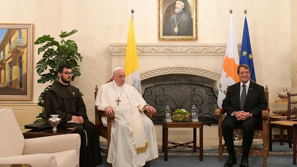 Sau nghi lễ chào đón, Tổng thống Sýp đã cùng Đức Thánh Cha vào tiền sảnh của Dinh Tổng thống và chụp hình chung, và hai vị đã hội kiến riêng tại phòng làm việc của Tổng thống.