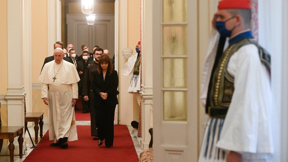 ĐTC được Tổng thống Katerina Sakellaropoulou của Hy Lạp đón tại lối vào Dinh Tổng thống. Nghi thức đón tiếp chính thức diễn ra bên trong Dinh Tổng Thống với Quốc thiều của Vatican và của Hy Lạp; sau đó, ĐTC chào đại diện của Hy Lạp và ngược lại, Tổng thống Hy Lạp chào đại diện của phái đoàn Tòa Thánh và giáo hội Hy Lạp.