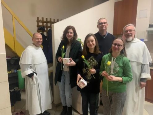 Hôm nay cha sở Valentine và Vyacheslav từ Dunaivtsi (giáo phận Kamianets-Podilskyi) đến thăm linh mục chúng tôi ở Kyiv. Xe tải nhỏ của họ chất đầy thực phẩm, bao gồm một vài xô bánh ngọt làm thủ công và vô số loại rau. Tất cả những thứ này ngay lập tức được chuyển đến các chị em Dòng Thừa sai Bác ái (những người của Mẹ Têrêsa thành Calcutta), là những người điều hành một trung tâm tại thủ đô Ukraina ở đây dành cho những người vô gia cư và những người túng thiếu. Trong nhiều năm qua, các cha dòng Đa Minh đã cử hành thánh lễ cho họ mỗi tuần hai lần, thường là bằng tiếng Anh vì các chị em đến từ nhiều quốc gia.