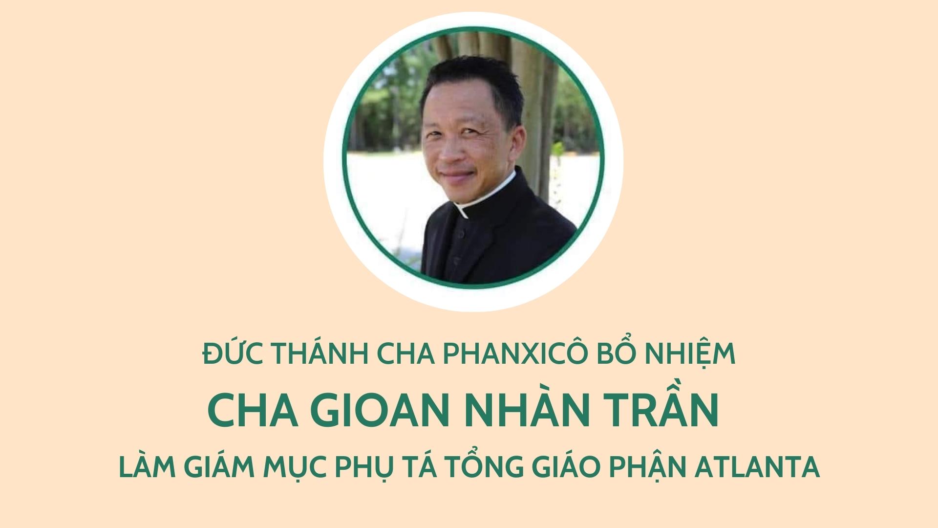 ATLANTA (25.10.2022) – Đức Thánh Cha Phanxicô đã bổ nhiệm Cha Gioan Nhàn Trần làm Giám mục Phụ tá Tổng Giáo phận Atlanta. Giám mục Trần, là người gốc Việt, sẽ đến Atlanta từ Tổng giáo phận New Orleans, nơi ngài hiện đang làm Linh Mục Chánh Xứ của Giáo Xứ Đức Mẹ Maria, Nữ Vương Hòa bình ở Mandeville, Louisiana. Lễ tấn phong sẽ diễn ra vào ngày 23 tháng 1 năm 2023.