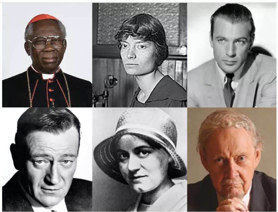(Theo chiều kim đồng hồ từ trên cùng bên trái: Đức Hồng y Francis Arinze, tôi tớ Chúa Dorothy Day, Gary Cooper, Robert Bork, Thánh Teresa Benedicta (Edith Stein) và John Wayne).