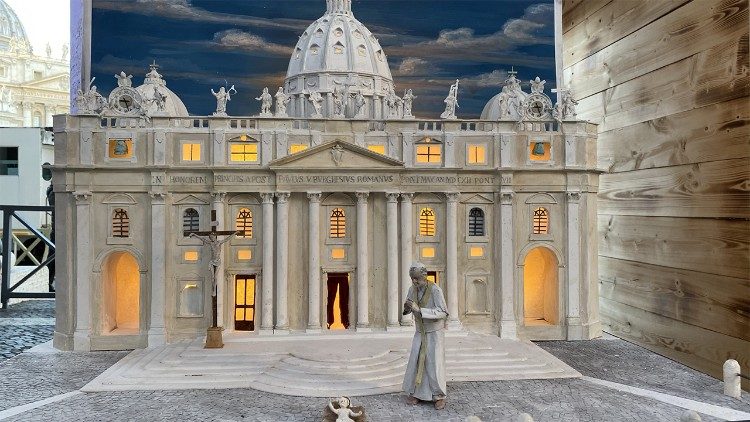Ngoài Đức Thánh Cha Phanxicô và Chúa Hài đồng trong máng cỏ, mô hình còn mô tả tiền đường của đền thờ thánh Phê-rô và cây Thánh giá phép lạ của Nhà thờ thánh Marcello ở đường Corso.