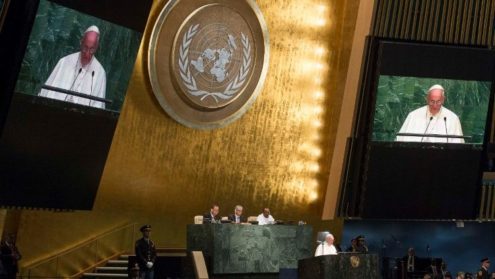 Phát biểu ngày 25/9/2015, tại Đại hội đồng Liên Hiệp Quốc, Đức Thánh Cha đã khẳng định rằng “Kinh nghiệm của 70 năm qua, vượt lên trên những điều đã đạt được, chứng tỏ rằng sự cải tổ và thích ứng của Liên Hiệp Quốc với thời đại là điều luôn luôn cần thiết, tiến tới mục tiêu chung kết là mang lại cho tất cả mọi nước, không trừ ai, một sự tham gia và ảnh hưởng thực sự và đồng đều trong các quyết định. Sự cần thiết phải có sự công bình hơn, có giá trị đặc biệt đối với các cơ quan có khả năng hành pháp thực sự như Hội đồng bảo an Liên Hiệp Quốc, các tổ chức tài chính và các nhóm hoặc cơ chế được thiết lập đặc biệt để đương đầu với các cuộc khủng hoảng kinh tế. Điều này sẽ giúp giới hạn bất kỳ thứ lạm dụng hoặc sự đòi hỏi thái quá nào, nhất là đối với các nước đang trên đường phát triển. Các tổ chức tài chính quốc tế cần cảnh giác về việc phát triển dài hạn cho các nước và để tránh sự tùng phục làm ngộp thở các nước ấy đối với các hệ thống tín dụng. Các hệ thống này thay vì thăng tiến sự phát triển, thì lại bắt dân chúng phải tùng phục những cơ cấu làm gia tăng nghèo đói, loại trừ và lệ thuộc”.