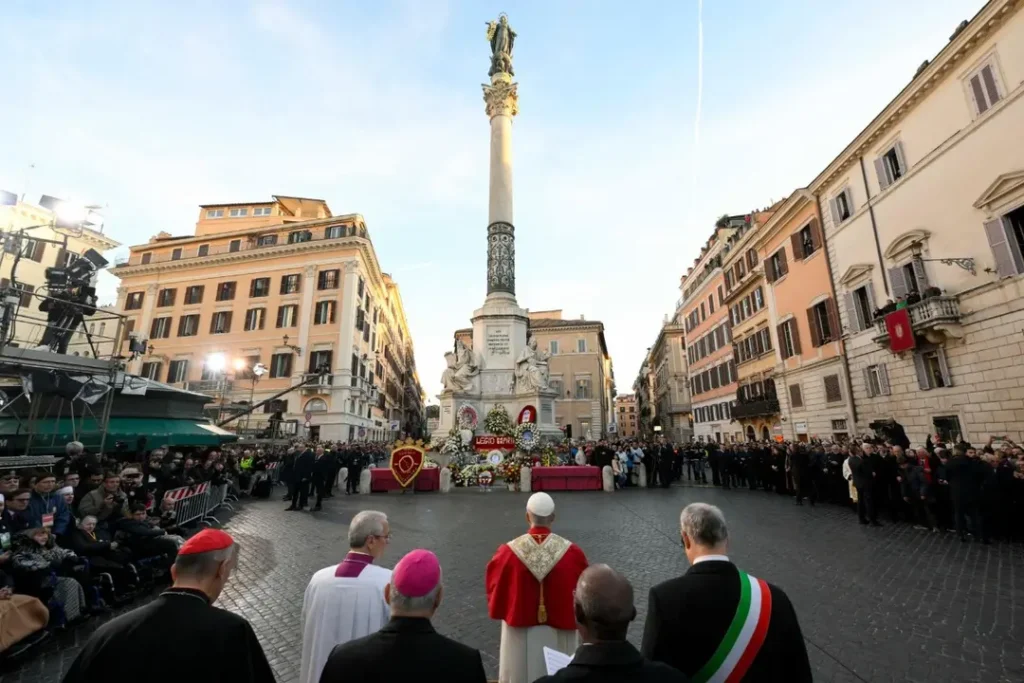 Vài giờ sau khi đọc Kinh Truyền Tin tại quảng trường Thánh Phêrô, Đức Thánh cha Lêô XIV đã đến chân Cột Đức Mẹ Vô Nhiễm Nguyên Tội, ở trung tâm Rôma, theo truyền thống do Đức Giáo hoàng Gioan XXIII khởi xướng vào năm 1958. Ngài đã được các nhà chức trách tôn giáo và chính trị của thành phố chào đón, trong đó có Tổng đại diện Giáo phận Rôma, Hồng y Baldassare Reina, và Thị trưởng Roberto Gaultieri.
