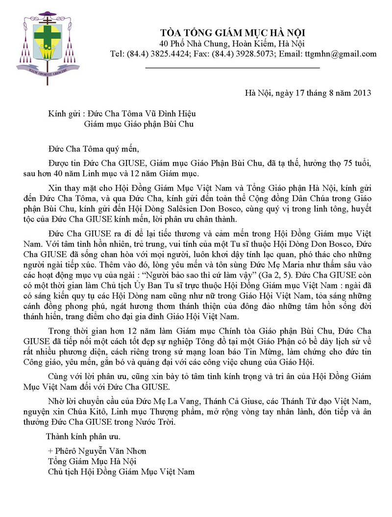 Thư phân ưu của Đức Tổng giám mục Chủ tịch Hội đồng Giám mục Việt Nam với giáo phận Bùi Chu
