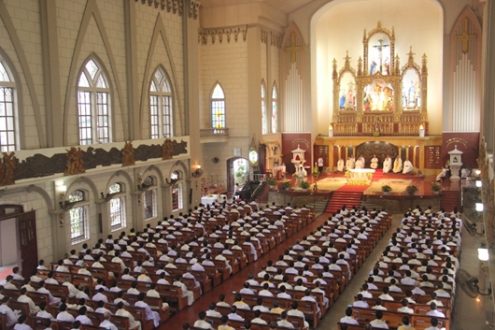 GIÁO PHẬN THÁI BÌNH / WHĐ (10.05.2017) – Lúc 14g30 thứ Ba 9 tháng 5 năm 2017, chương trình thường huấn đợt 1 cho các linh mục thuộc Giáo tỉnh Hà Nội –gồm Tổng giáo phận Hà Nội và 9 giáo phận: Bắc Ninh, Bùi Chu, Hải Phòng, Hưng Hóa, Lạng Sơn, Phát Diệm, Thanh Hóa, Thái Bình, và Vinh– đã khai mạc với Thánh lễ đồng tế tại Nhà thờ chính toà Thái Bình do Đức hồng y Phêrô Nguyễn Văn Nhơn, Tổng Giám mục Hà Nội, chủ tế, cùng với 10 giám mục trong giáo tỉnh và 668 linh mục tham dự thường huấn.