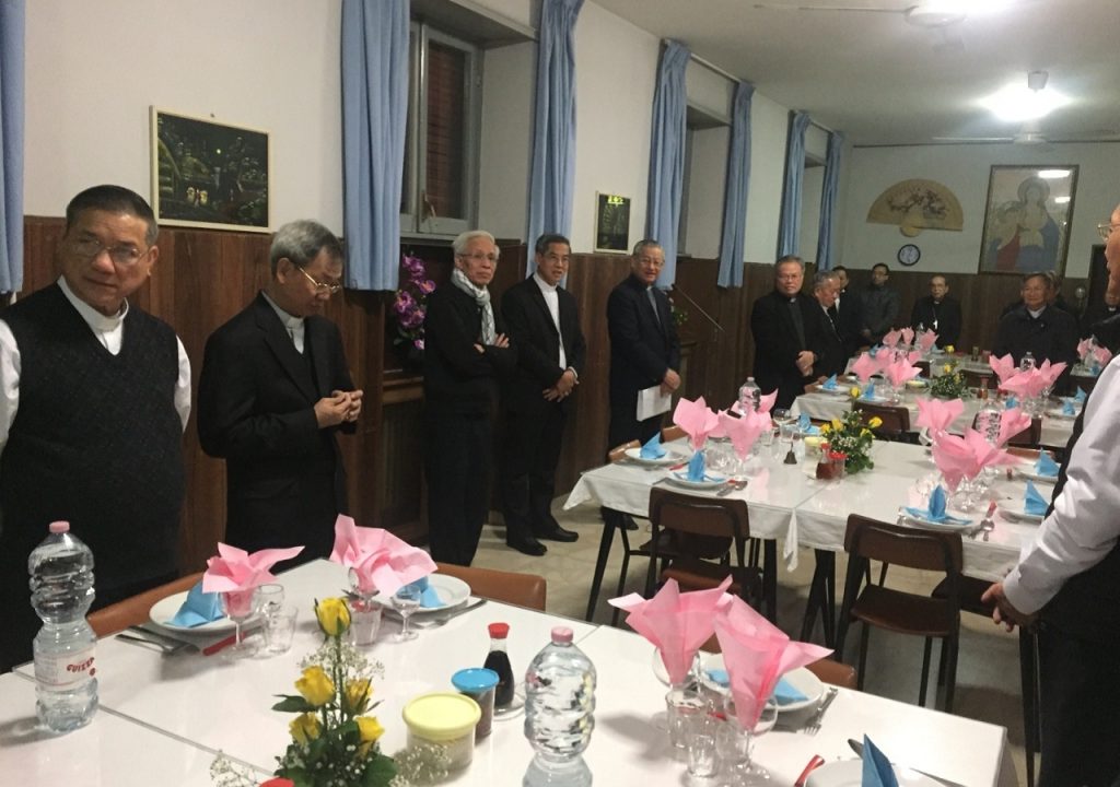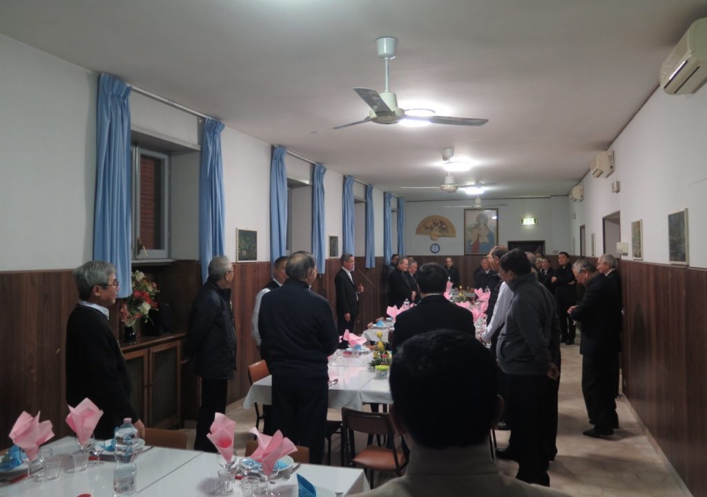 Trước bữa ăn tối, Đức cha Giuse Nguyễn Năng chào mừng quý Đức cha đã chọn đến và ở lại tại nhà Foyer Phát Diệm trong chuyến hành hương Ad limina 2018. Cha Giám đốc Gioan Trần Mạnh Duyệt và gia đình Foyer Phát Diệm cũng hân hoan chào đón và hứa sẽ chăm lo việc đi lại và ăn uống cho quý Đức cha và quý cha trong suốt thời gian ở lại tại Rôma. Nhân dịp này, Đức ông Gioan Baotixita Phạm Mạnh Cương, Chủ tịch Liên tu sĩ Việt Nam tại Rôma, cũng đến chào quý Đức cha. Đáp lời, Đức cha Chủ tịch cám ơn gia đình Foyer Phát Diệm đã luôn đón tiếp quý Đức cha trong suốt nhiều năm qua, mỗi khi các ngài có dịp đến Rôma, cám ơn Đức ông Cương và các linh mục Việt Nam tại Rôma đã giúp chuẩn bị một số công việc cho chuyến hành hương.