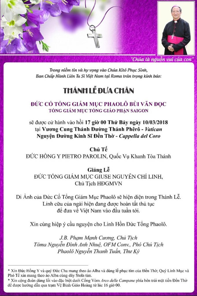 Thông báo về Thánh Lễ đưa chân Đức Cố TGM Phaolô Bùi Văn Đọc tại Rôma