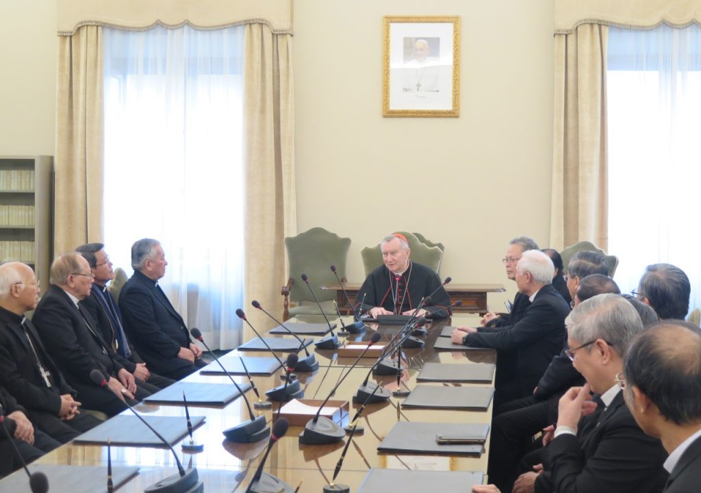 Sáng thứ Bảy 10/03, vào lúc 10g00, quý Đức cha trong Hội đồng Giám mục Việt Nam tới thăm Phủ Quốc Vụ Khanh của Tòa thánh. Đức Hồng y Quốc Vụ Khanh Pietro Parolin tiếp đoàn rất thân tình. Ngài ra tận hành lang đón từng Đức cha. Cùng với Đức Hồng y, còn có Đức Ông Phanxicô Xavie Cao Minh Dung, Tham Tán Phủ Quốc Vụ Khanh. Mở đầu cuộc gặp gỡ, Đức Hồng y chia buồn với Hội đồng Giám mục Việt Nam và Giáo hội tại Việt Nam vì sự ra đi của Đức Tổng Giám mục Phaolô Bùi Văn Đọc. Tiếp đó, ngài chào mừng quý Đức cha đã có chuyến Ad Limina thật ý nghĩa, có dịp yết kiến Đức Thánh Cha và các Bộ của Tòa thánh, có thời gian sống bên nhau thân mật, hiệp thông và huynh đệ. Thay mặt Hội đồng Giám mục Việt Nam, Đức Tổng Giám mục Giuse Nguyễn Chí Linh kính chào Đức Hồng y, bày tỏ tâm tình biết ơn ngài,với vai trò Quốc Vụ Khanh, đã luôn quan tâm tới Giáo hội tại Việt Nam. Cuộc gặp gỡ kéo dài 1 giờ 30 phút, xoay quanh tình hình Giáo hội tại Việt Nam, về đời sống đức tin của cộng đồng Dân Chúa.