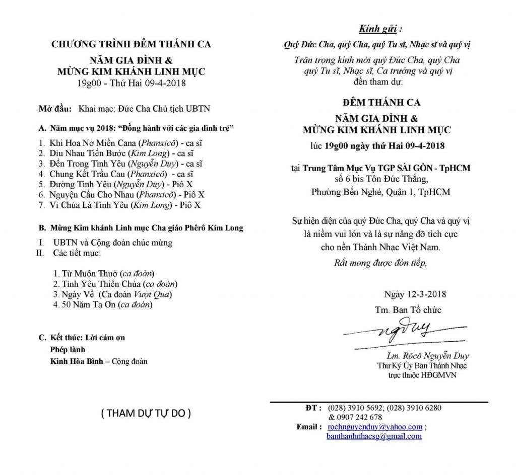 Uỷ ban Thánh nhạc: Thư mời tham dự Đêm Thánh ca “Năm Gia Đình”