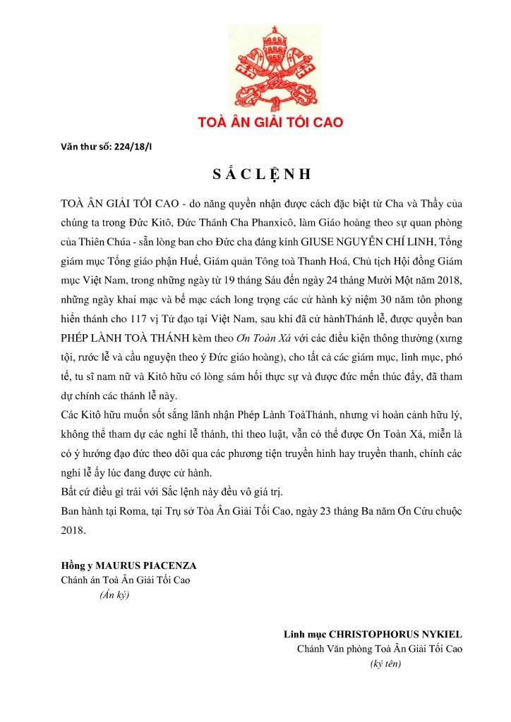 Sắc lệnh ban ơn toàn xá của Toà Ân Giải Tối Cao cho Năm Thánh tôn vinh 117 Thánh Tử Đạo Việt Nam