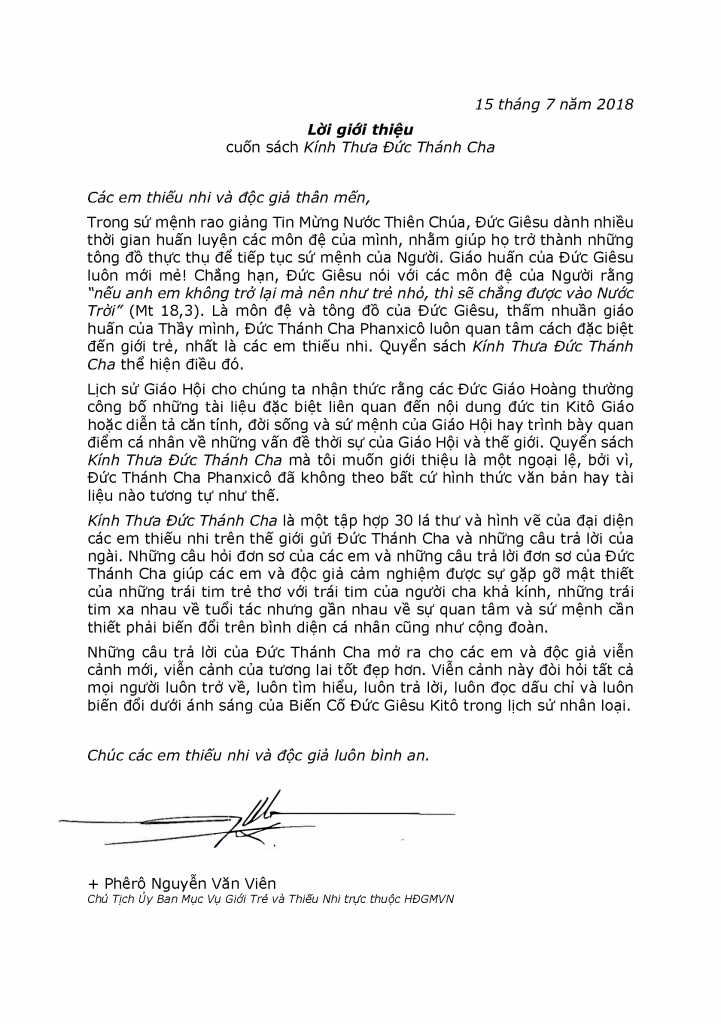 Trong sứ mệnh rao giảng Tin Mừng Nước Thiên Chúa, Đức Giêsu dành nhiều thời gian huấn luyện các môn đệ của mình, nhằm giúp họ trở thành những tông đồ thực thụ để tiếp tục sứ mệnh của Người. Giáo huấn của Đức Giêsu luôn mới mẻ! Chẳng hạn, Đức Giêsu nói với các môn đệ của Người rằng “nếu anh em không trở lại mà nên như trẻ nhỏ, thì sẽ chẳng được vào Nước Trời” (Mt 18,3). Là môn đệ và tông đồ của Đức Giêsu, thấm nhuần giáo huấn của Thầy mình, Đức Thánh Cha Phanxicô luôn quan tâm cách đặc biệt đến giới trẻ, nhất là các em thiếu nhi. Quyển sách “Kính Thưa Đức Thánh Cha” thể hiện điều đó.