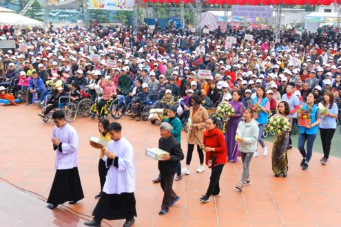 Đây đã là năm thứ 18 kể từ ngày đầu tiên những người khuyết tật được hội ngộ trong tình yêu thương của Chúa ngang qua bàn tay Đức Cha Phêrô Nguyễn Văn Đệ – Giám mục Giáo phận Thái Bình. Và qua mỗi năm số tham dự viên tham dự kỳ đại hội ngày một tăng lên. Đặc biệt năm nay, ngoài việc tiếp tục được đón nhận tình cảm yêu thương của các y bác sĩ đến từ Hà Nội, Sài Gòn, Thái Bình, các bác sĩ tình nguyện thuộc giáo phận Inchoen Hàn Quốc, đại hội còn vui mừng được chào đón sự hiện diện của quý Đức Cha Mario Yamanouchi đến từ Giáo phận Saitama – Nhật Bản, Đức Cha Giuse Châu Ngọc Tri – Giám mục Giáo phận Lạng Sơn và gần 1000 tình nguyện viên là các bạn giới trẻ, học sinh, sinh viên đến từ khắp nơi.