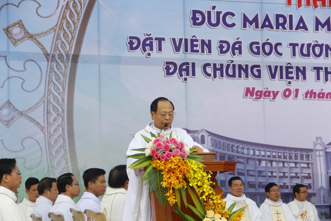 Mở đầu thánh lễ, Đức Cha Phêrô đã gửi đến toàn thể cộng đoàn những lời chào chúc của một năm mới dương lịch, cũng như tâm tình hướng lên Đức Mẹ là Mẹ của Giáo hội, Mẹ của Giáo phận. Ngài cũng nhắc nhớ đến cộng đoàn về truyền thống của giáo phận đó là dâng tất cả mọi sự, dâng những ý nguyện, cách đặc biệt dâng ĐCV cho Đức Trinh Nữ Maria, để qua Mẹ dâng lên Thiên Chúa. Qua đó, ngài cũng mời gọi hết thảy mọi thành phần dân Chúa cùng tạ ơn Thiên Chúa là trung tâm của thánh lễ đặt viên đá góc tường ĐCV Thánh Tâm và dâng toàn thể Giáo phận cho Đức Mẹ. Ngài cũng chia sẻ những tâm tình, những vất vả của bà con giáo dân đã đóng góp cho công trình qua những ngày trong giai đoạn chuẩn bị cho công trình. Hơn nữa, Đức cha Phêrô cũng nhấn mạnh đến lời cầu nguyện như là trách nhiệm của mỗi chủng sinh, linh mục đối với các đấng bậc, quý bà con giáo dân đã thương và ủng hộ cho công trình ĐCV hôm nay.