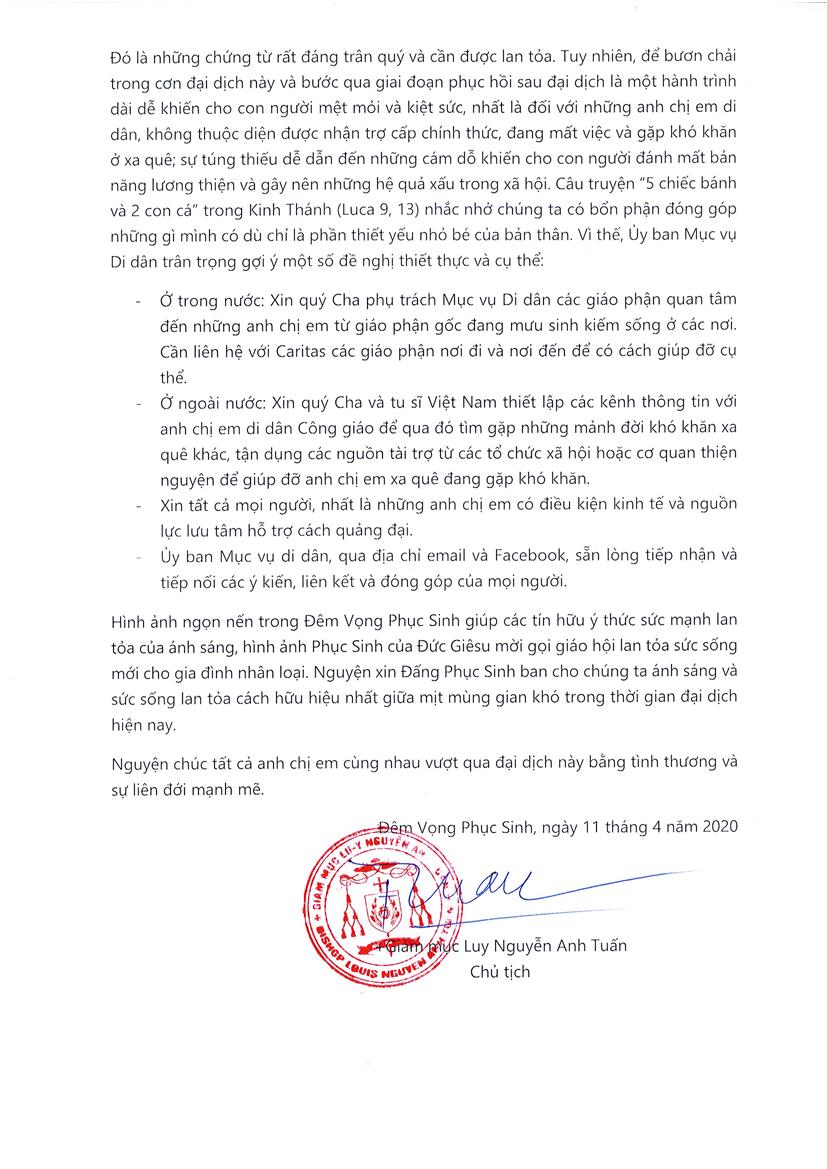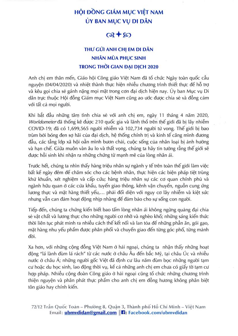 Anh chị em thân mến, Giáo hội Công giáo Việt Nam đã tổ chức Ngày toàn quốc cầu nguyện (04/04/2020) và nhiệt thành thực hiện nhiều chương trình thiết thực để hỗ trợ và kêu gọi chia sẻ gánh nặng mọi mặt trong cơn đại dịch hiện nay. Ủy ban Mục vụ Di dân trực thuộc Hội đồng Giám mục Việt Nam cũng ao ước được chia sẻ và đồng cảm với tất cả mọi người.
