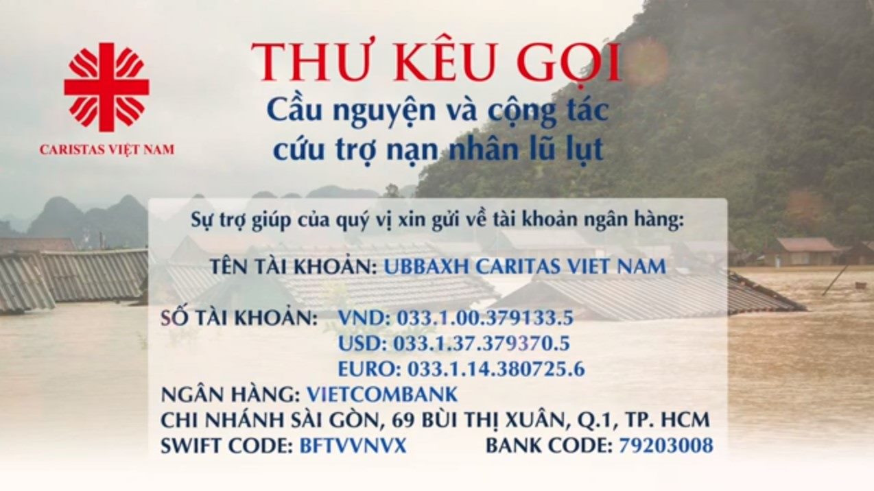 Theo trung tâm dự báo Khí tượng thủy văn quốc gia, những ngày tới sẽ còn có các đợt áp thấp nhiệt đới gây mưa lớn ở miền Trung. Đứng trước nguy cơ lũ chồng lũ và những cảnh mất mát đau thương nêu trên, Ủy ban Bác ái Xã hội – Caritas Việt Nam (UBBAXH-Caritas Việt Nam) thiết tha kêu gọi mọi thành phần Dân Chúa, trong nước cũng như ở hải ngoại tích cực cầu nguyện và quảng đại giúp đỡ đồng bào miền Trung vượt qua những khó khăn, khắc phục hậu quả thiên tai.