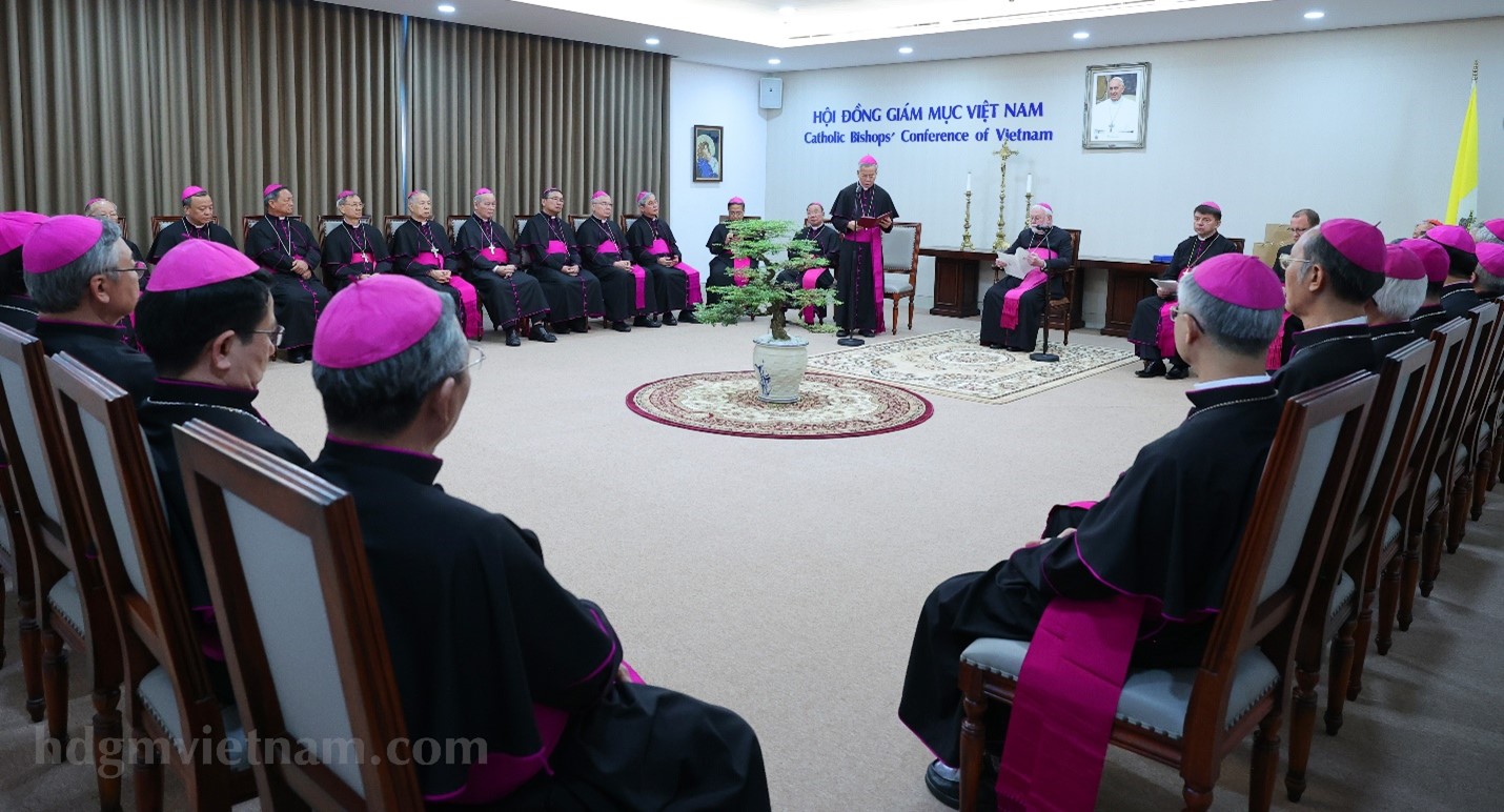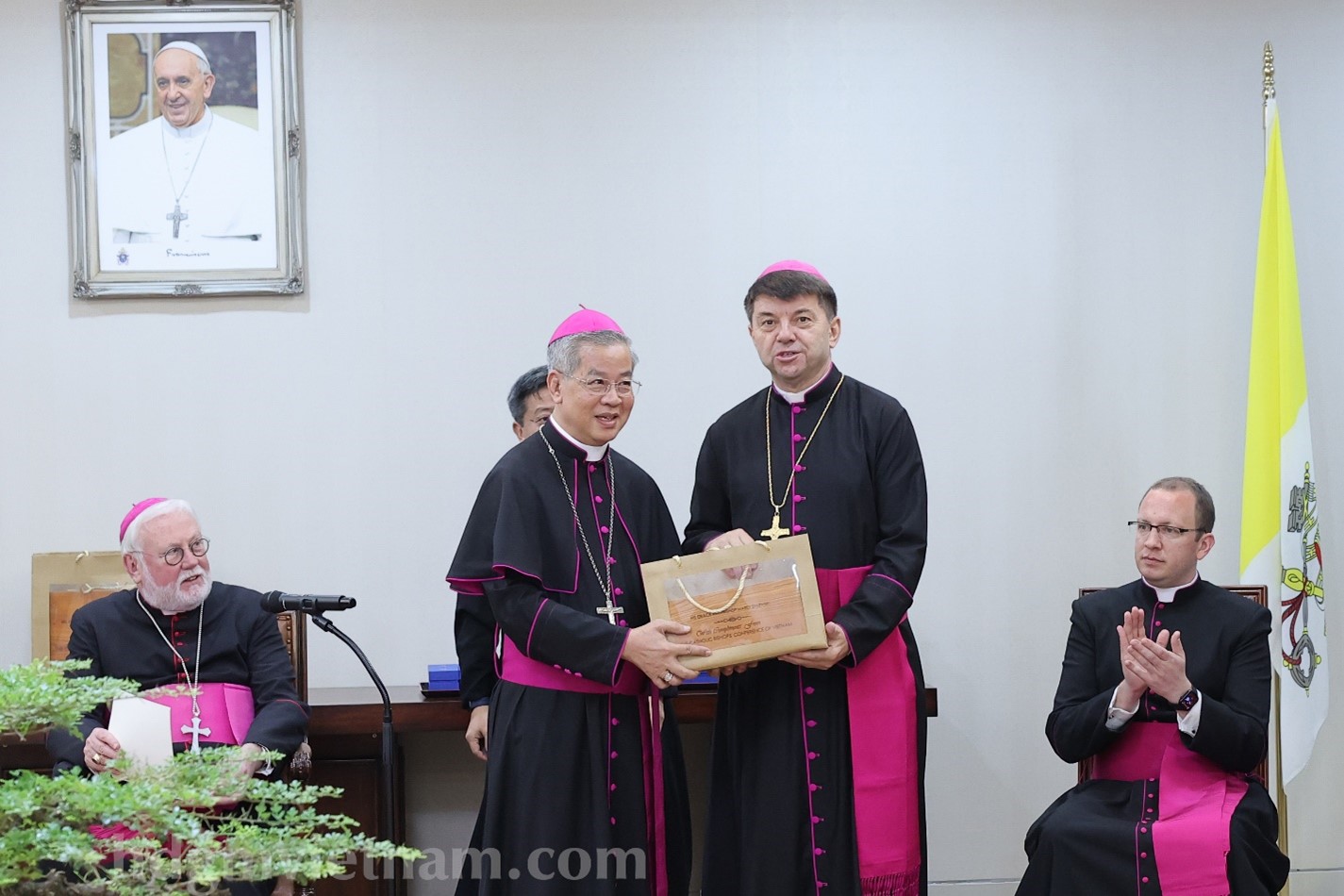 Đức TGM Giuse Nguyễn Năng – Chủ tịch HĐGMVN – đã trân trọng chào mừng Đức TGM Paul Richard Gallagher – Bộ Trưởng Ngoại giao Tòa Thánh, Đức TGM Marek Zalewski – Đại diện Thường trú của Tòa Thánh tại Việt Nam, và Đức ông John David Putzer.