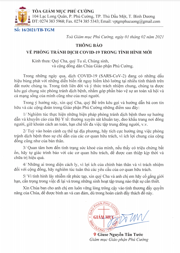 Toà Giám mục Phú Cường, ngày 01 tháng 02 năm 2021