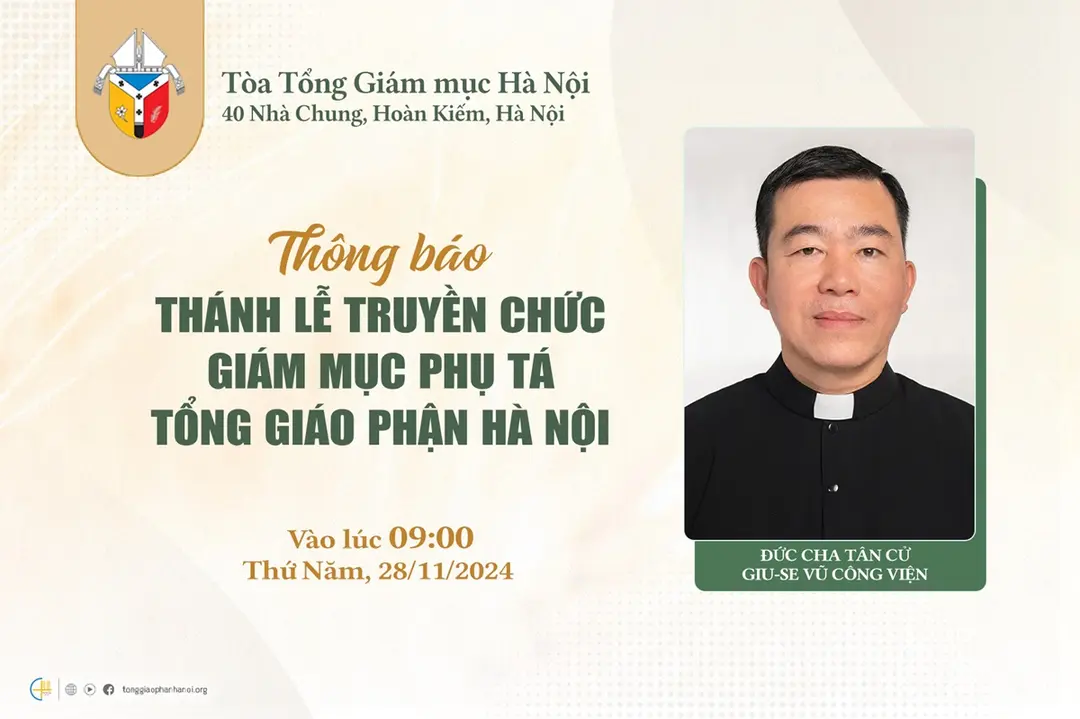 THÔNG BÁO VỀ THÁNH LỄ TRUYỀN CHỨC GIÁM MỤC PHỤ TÁ TỔNG GIÁO PHẬN HÀ NỘI