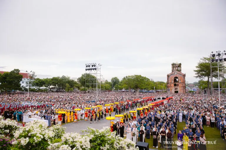 “La Vang – Lời tình yêu đã qua hơn 2 thế kỷ, khai nguyên từ lòng Hiền mẫu dấu yêu. Lời kì diệu mãi vang ngân: ‘Từ nay về sau, hễ ai chạy đến cầu khẩn cùng Mẹ tại chốn này, Mẹ sẽ nhận lời, ban ơn theo ý nguyện’.” – Đó là tâm tình của khoảng hơn 90.000 tín hữu sáng ngày 15.08.2025 tham dự cuộc rước kiệu tôn vinh Đức Mẹ La Vang – Đấng cách đây 227 năm đã từng hiện ra tại nơi này để phù trợ, đỡ nâng, đồng hành với các giáo dân đang lâm cảnh khốn cùng vì bách hại.