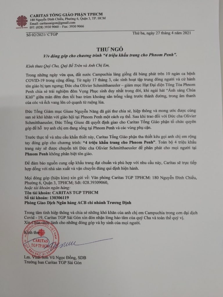 Trong tâm tình hiệp thông và chia sẻ những khó khăn của anh chị em Campuchia trong cơn đại dịch Covid-19, Caritas TGP Sài Gòn xin đón nhận lòng hảo tâm của quý Cha và toàn thể quý vị.