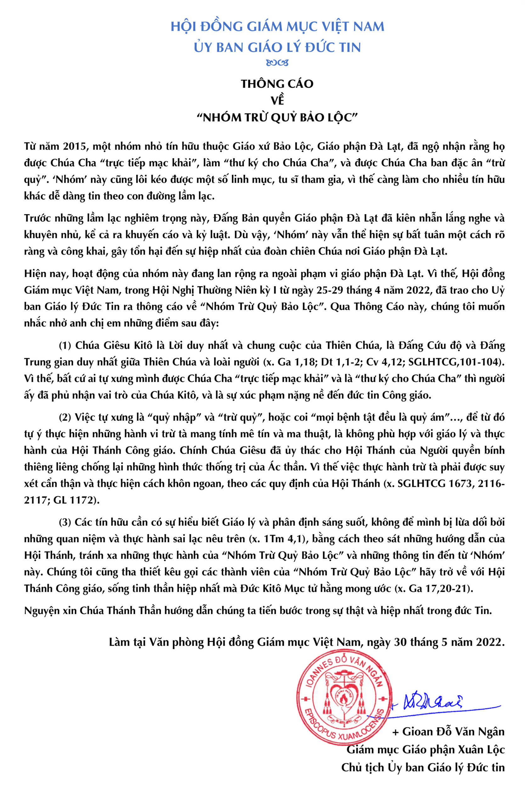 Hiện nay, hoạt động của nhóm này đang lan rộng ra ngoài phạm vi giáo phận Đà Lạt. Vì thế, Hội đồng Giám mục Việt Nam, trong Hội Nghị Thường Niên kỳ I từ ngày 25-29 tháng 4 năm 2022, đã trao cho Uỷ ban Giáo lý Đức Tin ra thông cáo về “Nhóm Trừ Quỷ Bảo Lộc”. Qua Thông Cáo này, chúng tôi muốn nhắc nhở anh chị em những điểm sau đây: