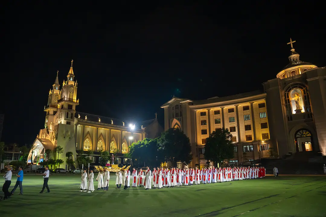 Vào lúc 19h00, các tham dự viên sốt sắng cung nghinh tượng Thánh nữ Anê Lê Thị Thành – Quan thầy UBGD toàn quốc – chứng nhân đức tin anh dũng. Hình ảnh đoàn rước trang nghiêm tôn vinh Thánh Quan thầy tiến vào nhà thờ, làm bừng sáng niềm tin, gợi nhắc hành trình kiên trung sống đạo của bao thế hệ tín hữu Việt Nam.