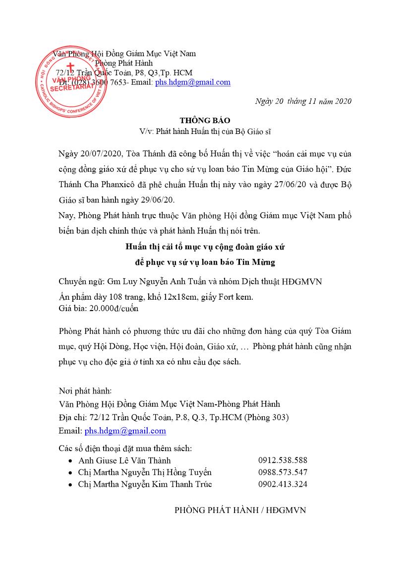 Nay, Phòng Phát hành trực thuộc Văn phòng Hội đồng Giám mục Việt Nam phổ biến bản dịch chính thức và phát hành Huấn thị nói trên.