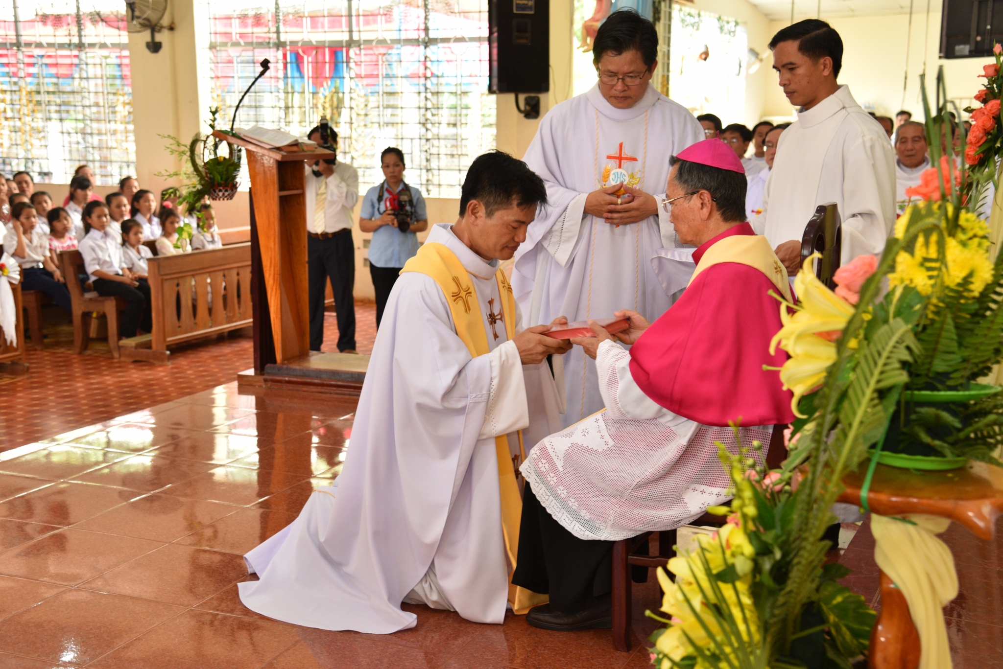 2. Đức Cha Giáo phận trao Dây Các Phép (quyền cử hành các bí tích) và Sách Tin mừng (quyền giáo huấn) cho Cha Tân Chánh xứ.