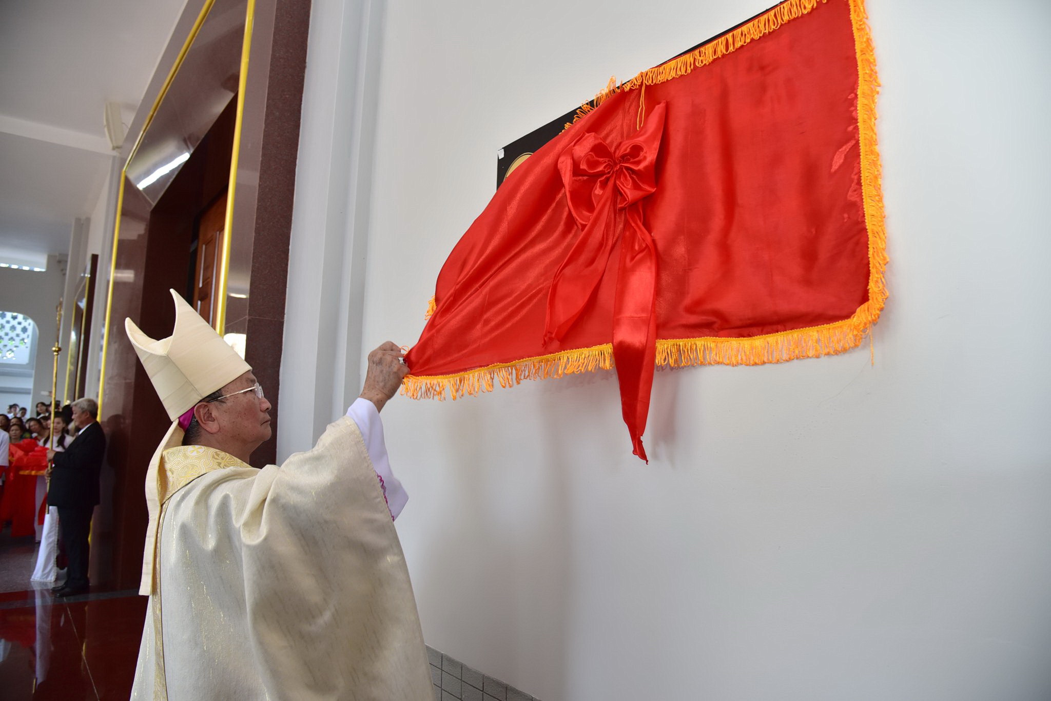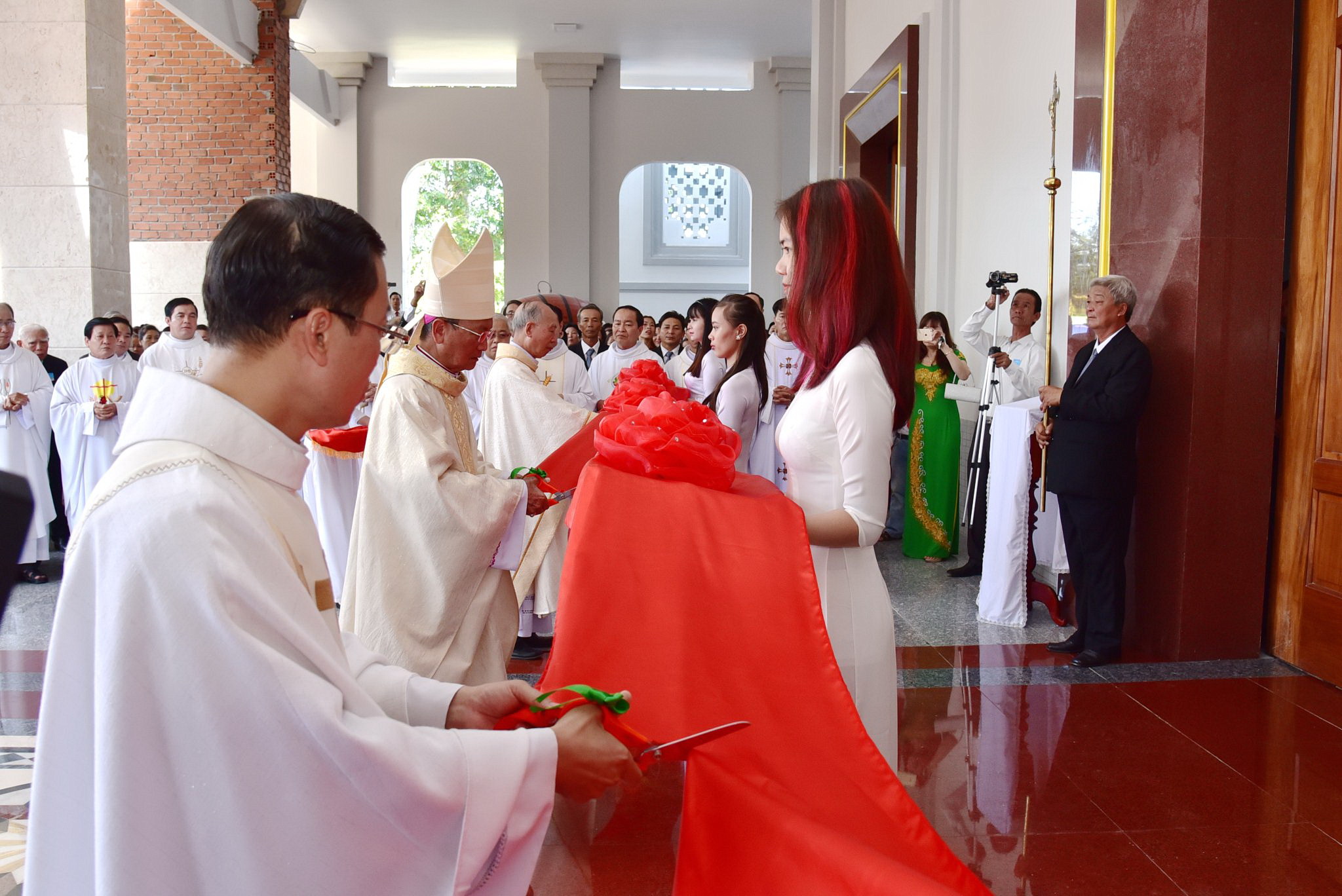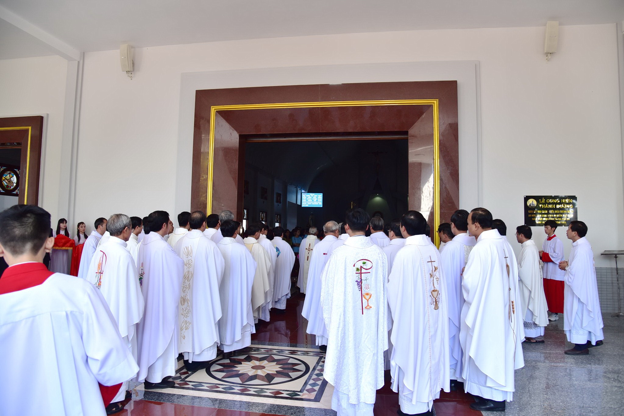 Đoàn đồng tế đã dừng lại tại tiền sảnh nhà thờ để tham dự Nghi thức Cắt băng khánh thành và mở cửa thánh đường. Sau đó, đoàn đồng tế cùng cộng đoàn tiến vào Nhà Chúa cùng dâng lời tôn vinh và tạ ơn Thiên Chúa.