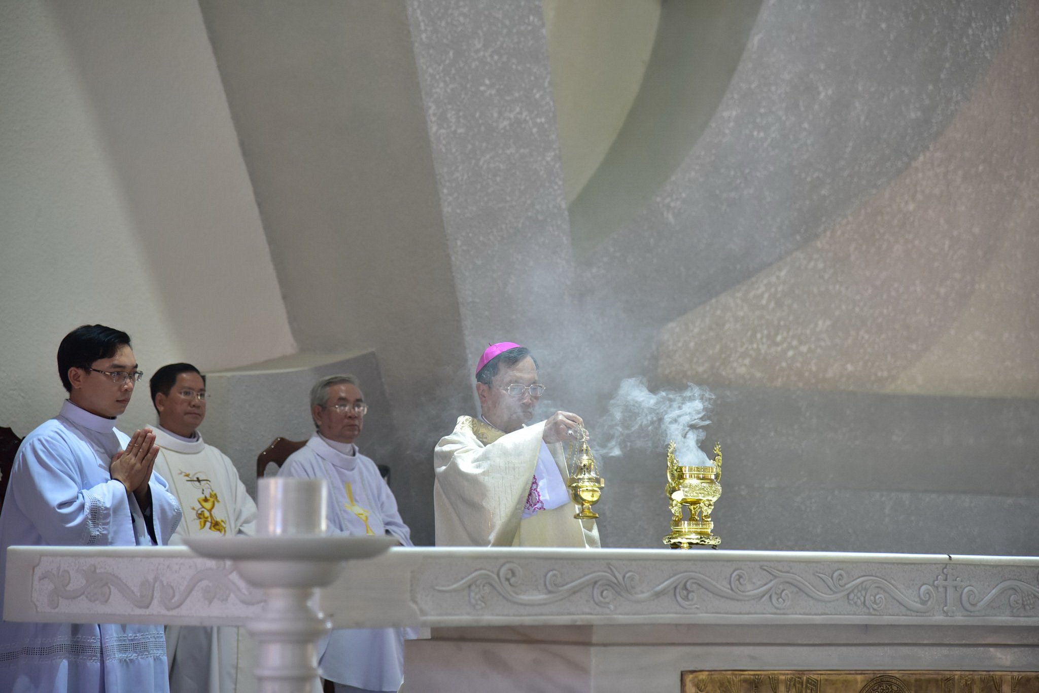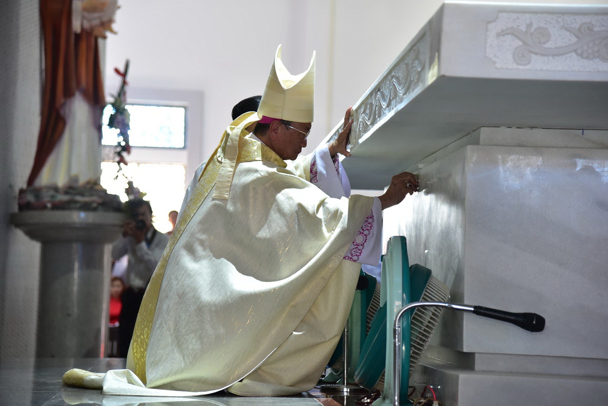 Sau phần phụng vụ Lời Chúa, Đức Cha đã cử hành Nghi thức Cung hiến Bàn thờ và Nhà thờ. Nghi thức khởi đầu bằng Kinh cầu các Thánh, sau đó Đức Giám mục niêm ấn xương các Thánh Tử Đạo tại chân bàn thờ. Sau lời nguyện cung hiến, Đức Cha đã xức dầu thánh và xông hương bàn thờ mới, xức dầu thánh các thánh giá trên tường nhà thờ, thắp nến sáng bàn thờ để xin Thiên Chúa đoái nhìn của lễ Hội Thánh sẽ dâng trên bàn thờ này, và làm cho Dân Chúa trở nên của lễ muôn đời dâng lên Chúa.