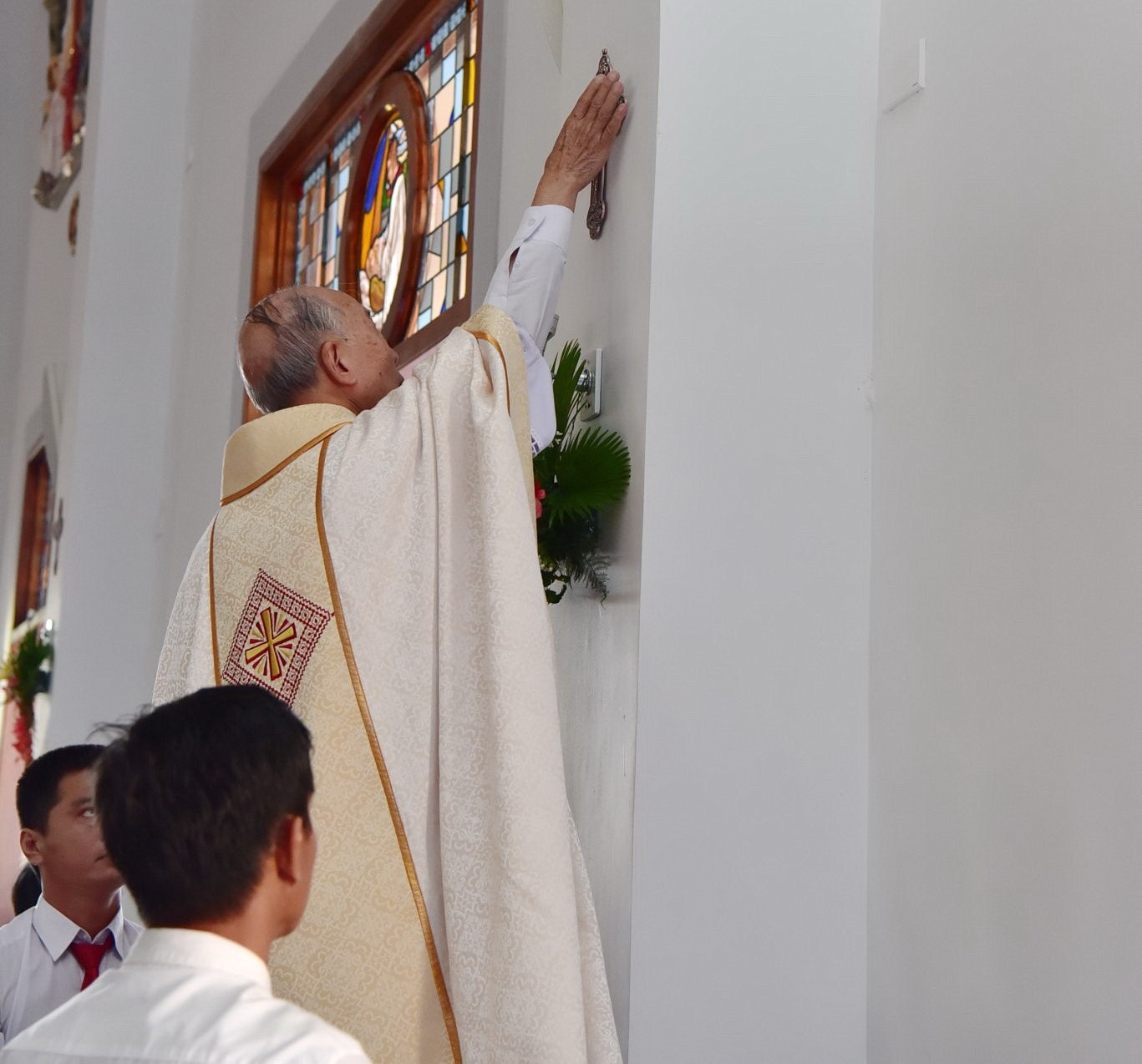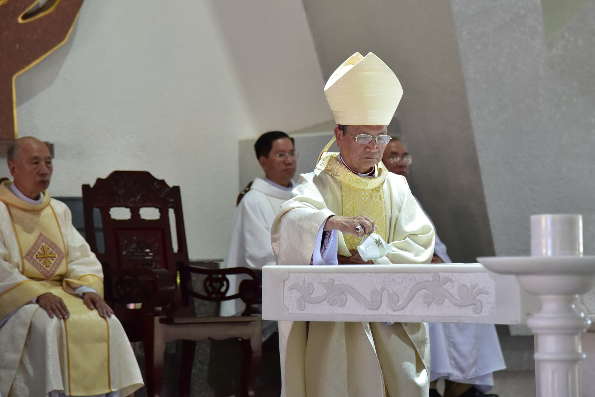 Tiếp đến, Đức Cha đã chủ sự nghi thức làm phép nước, rảy nước thánh thanh tẩy ngôi nhà thờ mới được trùng tu.