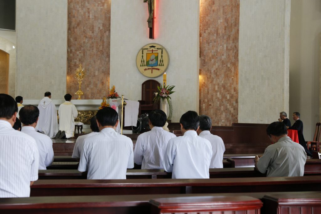 Sau đó, quỳ trước Thánh Thể Chúa, 2 Đức cha và quý Cha cùng nhau nhìn lại một năm đã qua, cách riêng trong việc thi hành sứ vụ mục tử nơi đoàn chiên được trao phó. Nhìn lại để xin lỗi Chúa về những thiếu sót, nhìn lại cũng để tạ ơn Thiên Chúa vì muôn ơn lành Chúa đã thương ban cho bản thân và cho cộng đoàn tín hữu. Đồng thời, cũng xin Chúa thương chúc lành trong năm mới Đinh Dậu này.