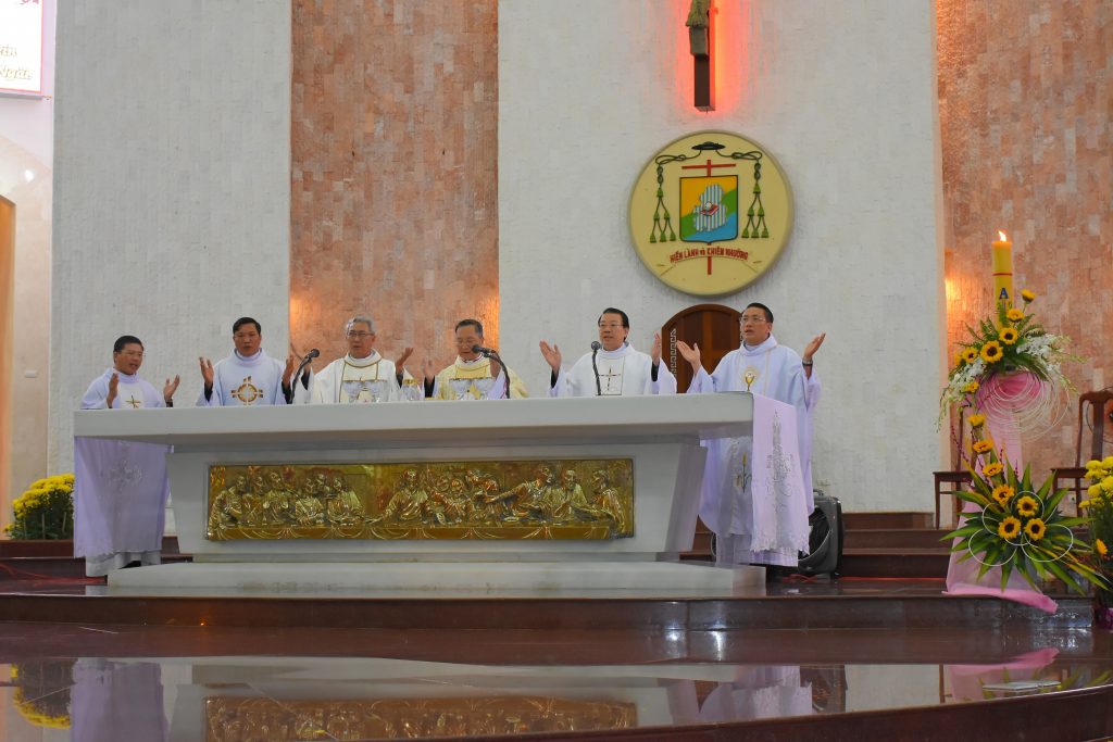 Đức Cha chính Giáo phận Tôma Nguyễn Văn Trâm chủ sự Thánh lễ. Đồng tế với ngài có Đức Cha phó Emmanuel, Cha Chánh xứ và các Cha phó xứ giáo xứ Chánh Tòa.