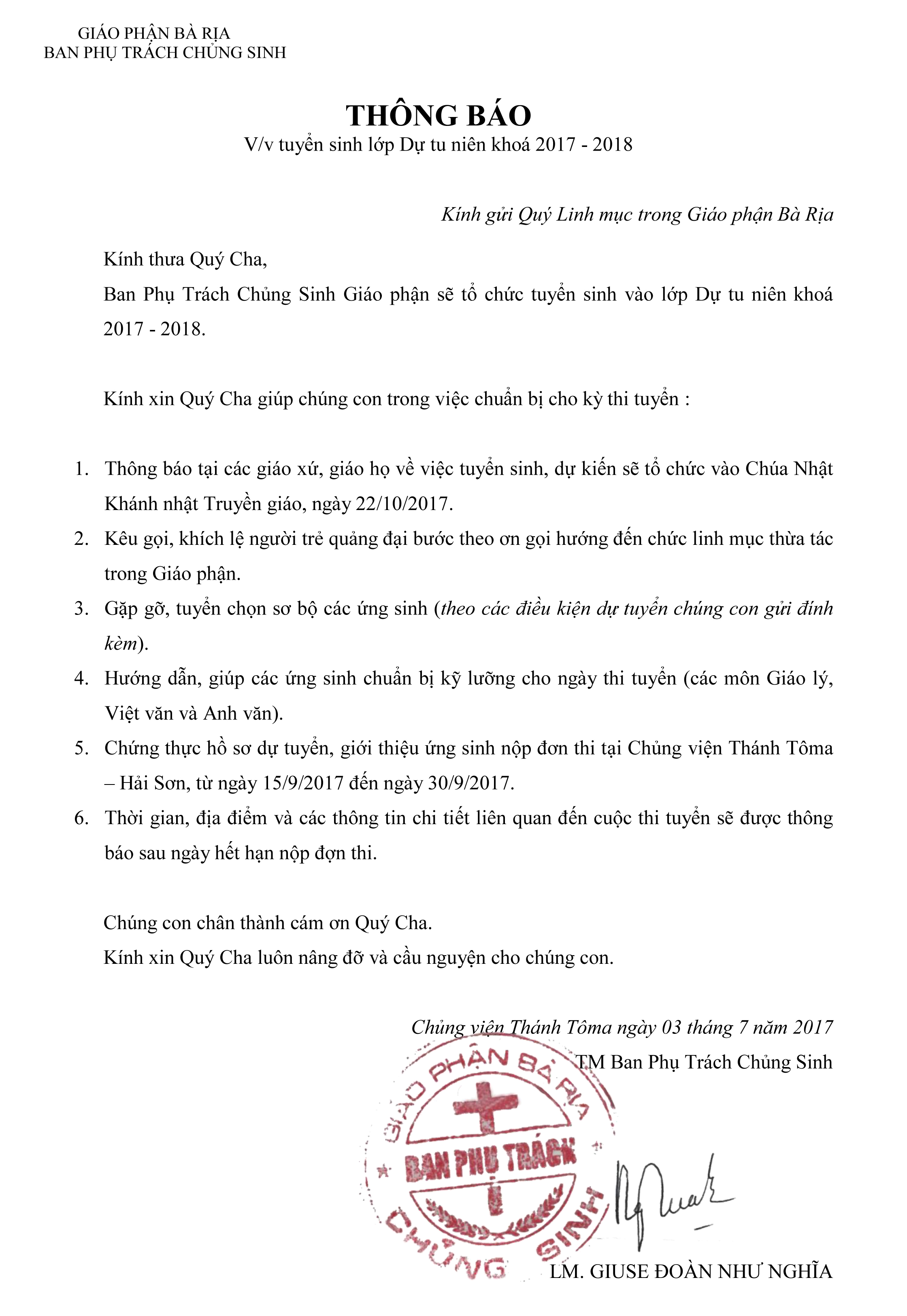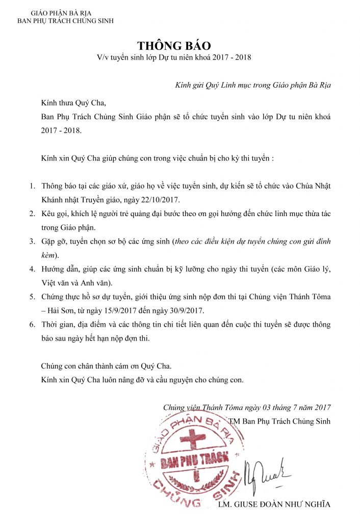 V/v tuyển sinh lớp Dự tu niên khoá 2017 – 2018