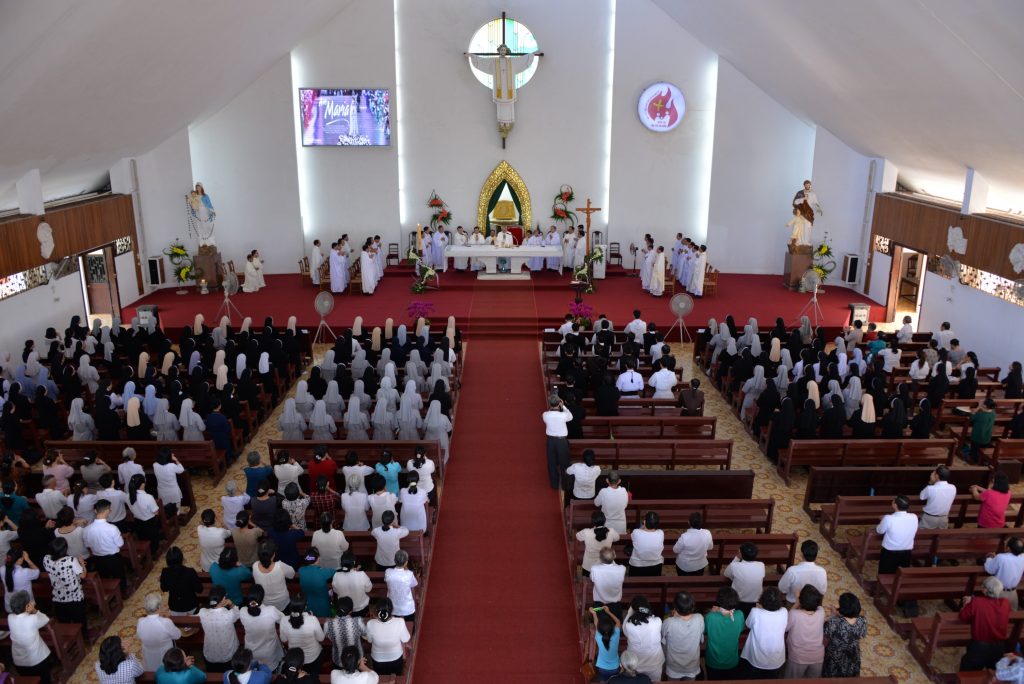 Tham dự thánh lễ có các tu sĩ nam nữ, giáo dân và du khách hành hương.