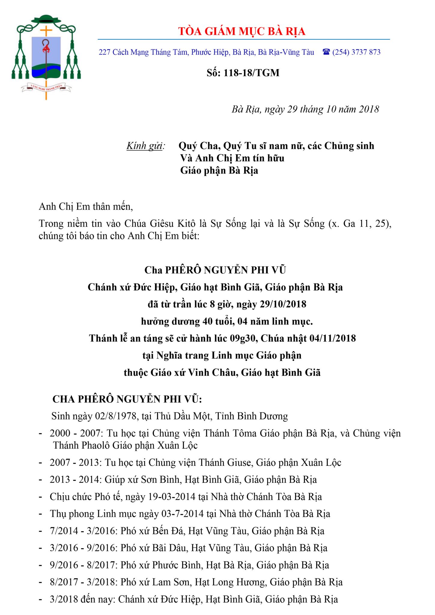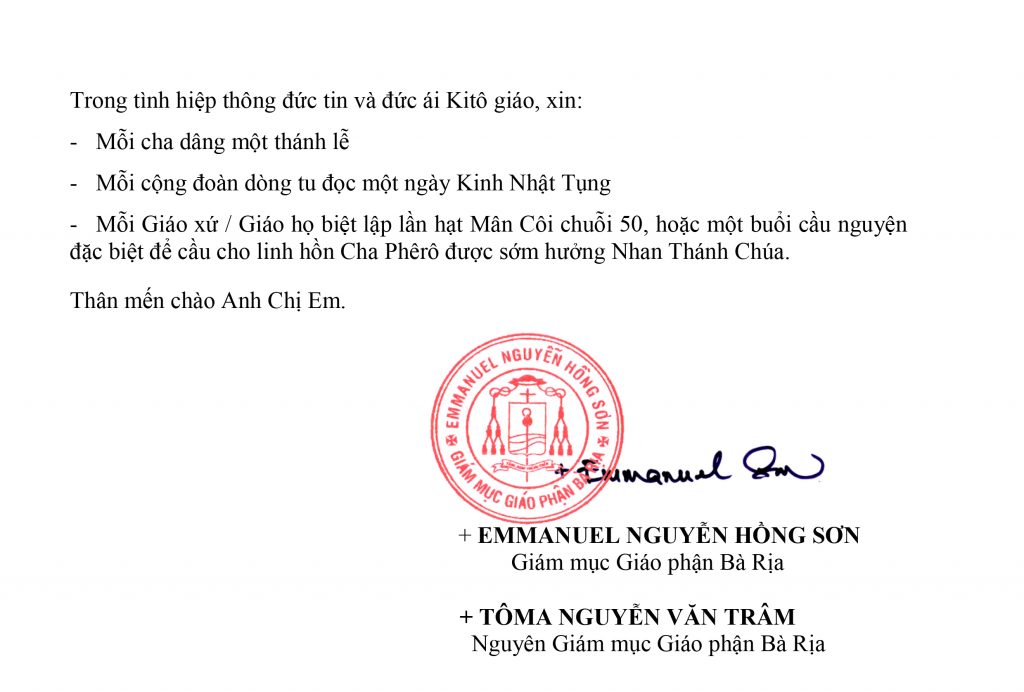 TÒA GIÁM MỤC BÀ RỊA KÍNH BÁO: CHA PHÊRÔ NGUYỄN PHI VŨ ĐÃ VỀ CÙNG CHÚA