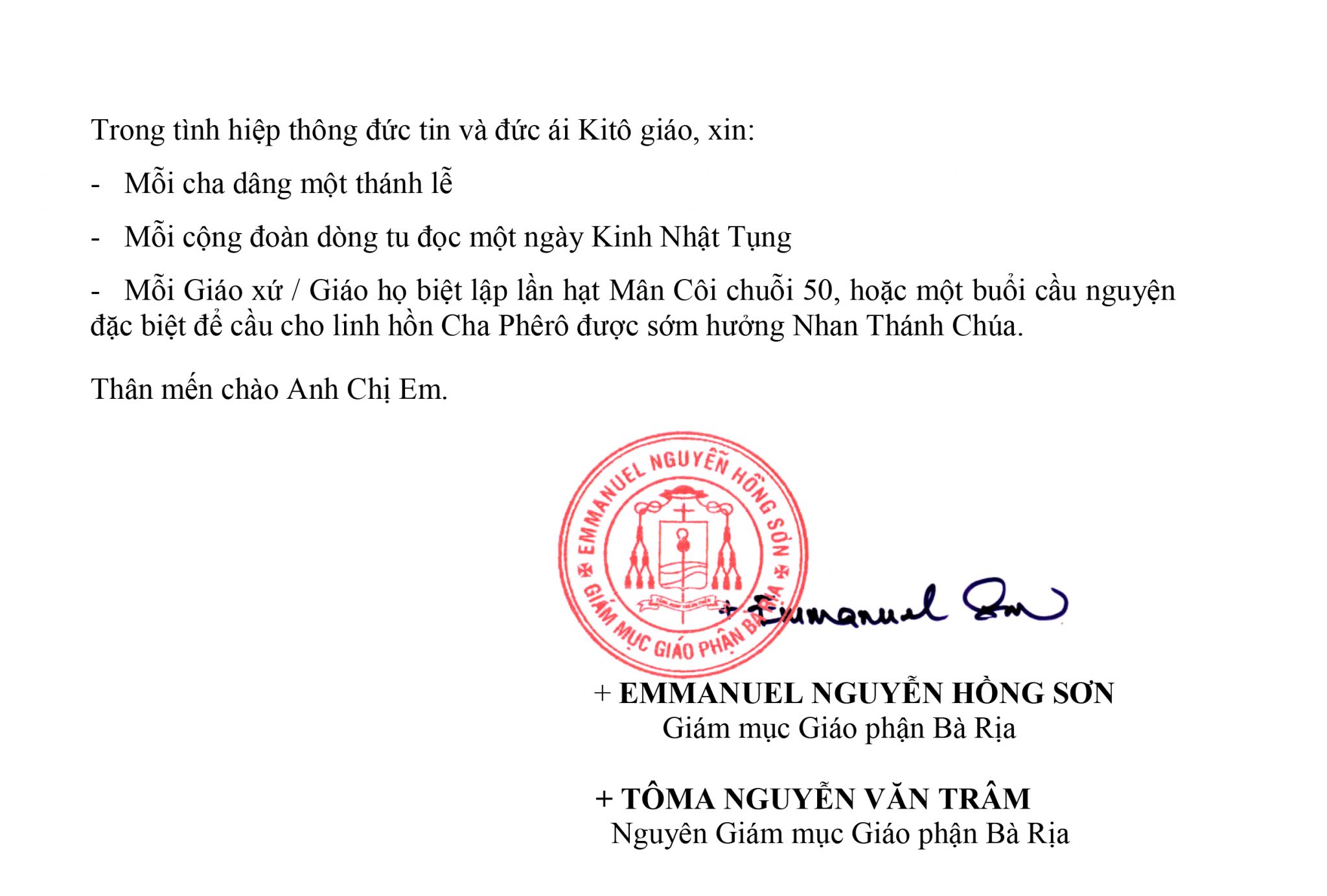 TÒA GIÁM MỤC BÀ RỊA: THƯ BÁO TỬ: CHA CỐ PHAOLÔ NGUYỄN HỮU THỜI