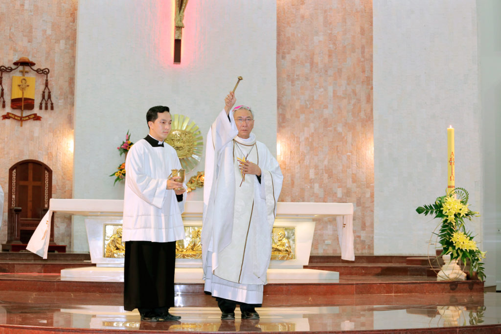 Mở đầu thánh lễ, Đức cha mời gọi cộng đoàn đón nhận tràn đầy niềm vui và ánh sáng của Chúa Phục Sinh. Đức cha cũng làm phép nước, rảy nước trên cộng đoàn và đồng thời xin ơn Chúa nâng đỡ chúng ta luôn trung thành sống theo ơn Thánh Thần mà Thiên Chúa đã trao ban.