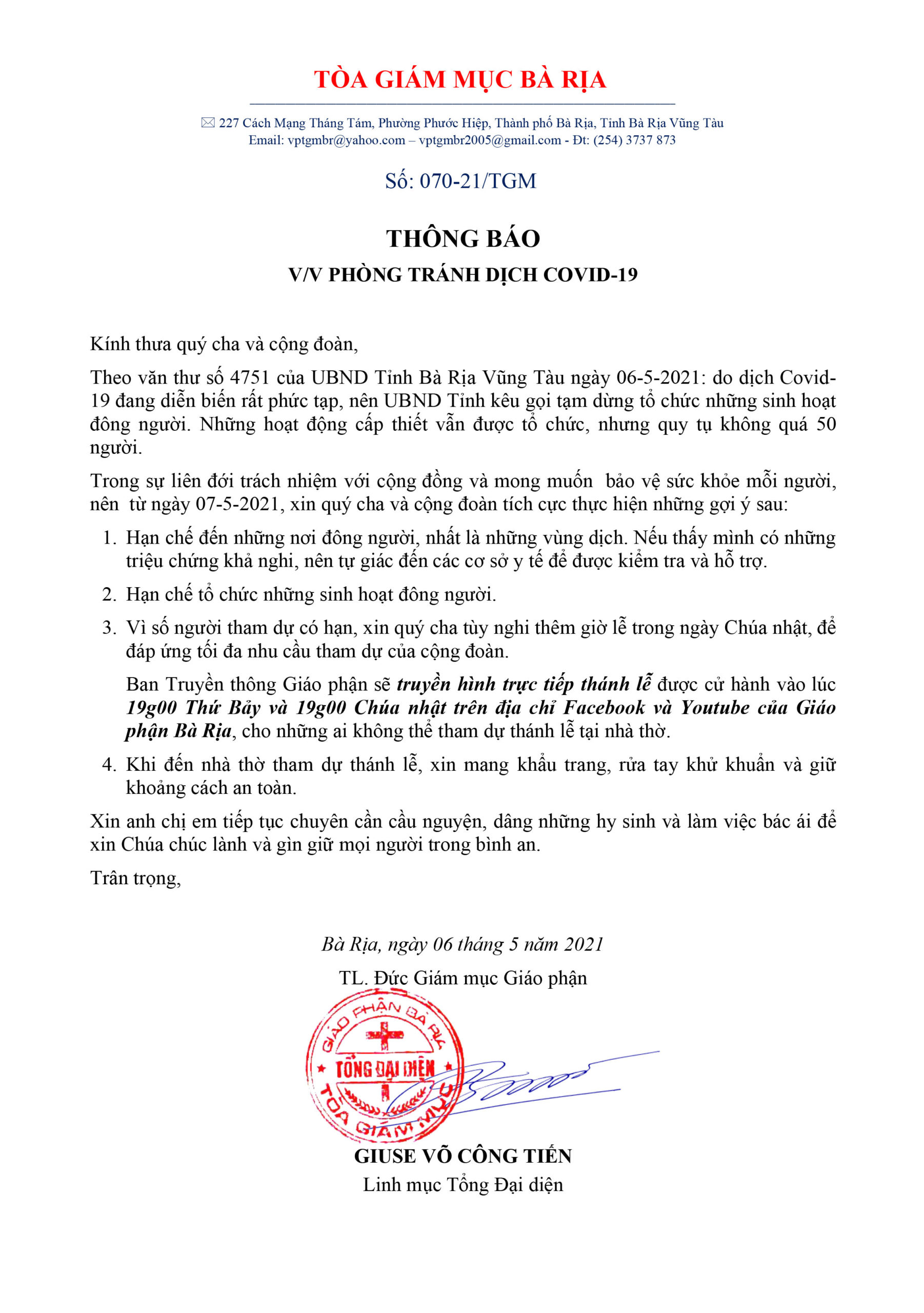 Trong sự liên đới trách nhiệm với cộng đồng và mong muốn bảo vệ sức khỏe mỗi người, nên từ ngày 07-5-2021, xin quý cha và cộng đoàn tích cực thực hiện những gợi ý sau: